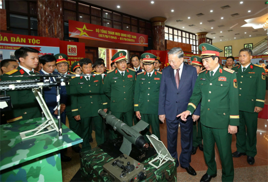 | Tổng Bí Thư Tô Lâm và lãnh đạo Bộ Quốc phòng tham quan sản phẩm nghiên cứu của Viện. |