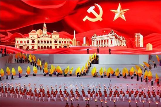 | Chương trình “Dưới lá cờ vẻ vang của Đảng” là điểm nhấn đặc biệt, giàu ý nghĩa chính trị - văn hóa - nghệ thuật, thể hiện niềm tin son sắt của toàn Đảng, toàn dân, toàn quân đối với sự lãnh đạo của Đảng Cộng sản Việt Nam, quyết tâm đoàn kết một lòng thực hiện thắng lợi Nghị quyết Đại hội XIV. Ảnh: TTXVN |