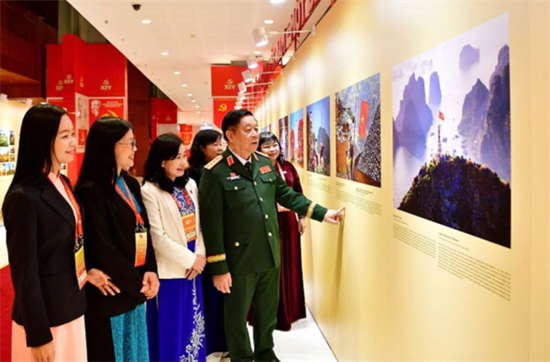| Đại tướng Nguyễn Trọng Nghĩa và các đại biểu tham quan khu trưng bày ảnh tại Đại hội XIV của Đảng. Ảnh: TRỌNG HẢI |