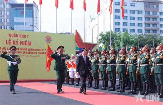 Sáng 9/12, Đảng ủy, Bộ Tư lệnh Quân khu 7 đã tổ chức trọng thể Lễ kỷ niệm 80 năm Ngày truyền thống Lực lượng vũ trang (LLVT) Quân khu 7 (10/12/1945 - 10/12/2025) và đón nhận danh hiệu Anh hùng LLVT nhân dân. Chủ tịch nước Lương Cường, Chủ tịch Hội đồng Quốc phòng và An ninh, thống lĩnh LLVT nhân dân dự và trao danh hiệu cao quý tặng LLVT Quân khu 7.
