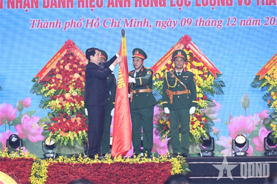 | Chủ tịch nước Lương Cường gắn Huy hiệu Anh hùng LLVT nhân dân lên Quân kỳ Quyết thắng tặng LLVT Quân khu 7. |