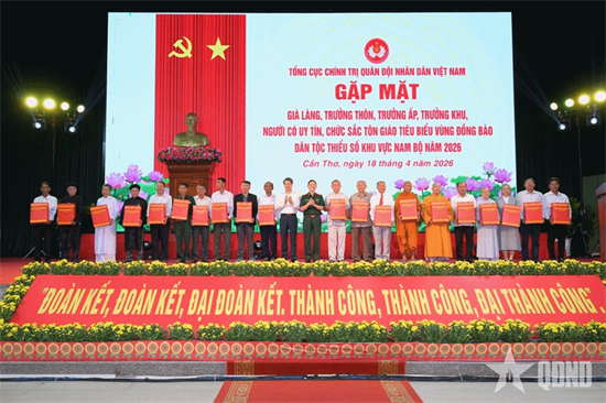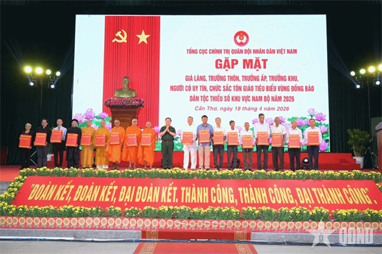 Sáng 18/4, tại TP Cần Thơ, Tổng cục Chính trị phối hợp với TP Cần Thơ tổ chức chương trình gặp mặt già làng, trưởng thôn, trưởng ấp, trưởng khu, người có uy tín, chức sắc tôn giáo khu vực Nam Bộ năm 2026.