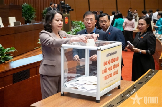 | Phó Chủ tịch nước Võ Thị Ánh Xuân cùng các đại biểu Quốc hội ủng hộ đồng bào vùng bão lũ. Ảnh: PHẠM THẮNG |