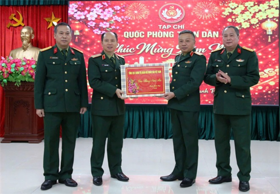 | Thủ trưởng Tổng cục Chính trị tặng quà chúc Tết Tạp chí Quốc phòng toàn dân. |