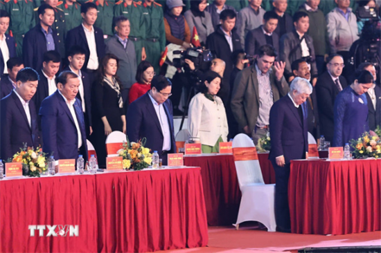 | Thủ tướng Phạm Minh Chính và các đại biểu tưởng niệm đồng bào bị thiệt mạng do bão lũ. Ảnh: Dương Giang/TTXVN |