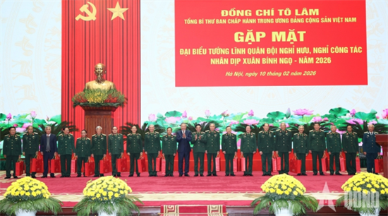 Chiều 10/2, tại Hà Nội, Tổng Bí thư Tô Lâm, Bí thư Quân ủy Trung ương (QUTƯ) gặp mặt đại biểu tướng lĩnh Quân đội nghỉ hưu, nghỉ công tác nhân dịp đón Xuân Bính Ngọ 2026.